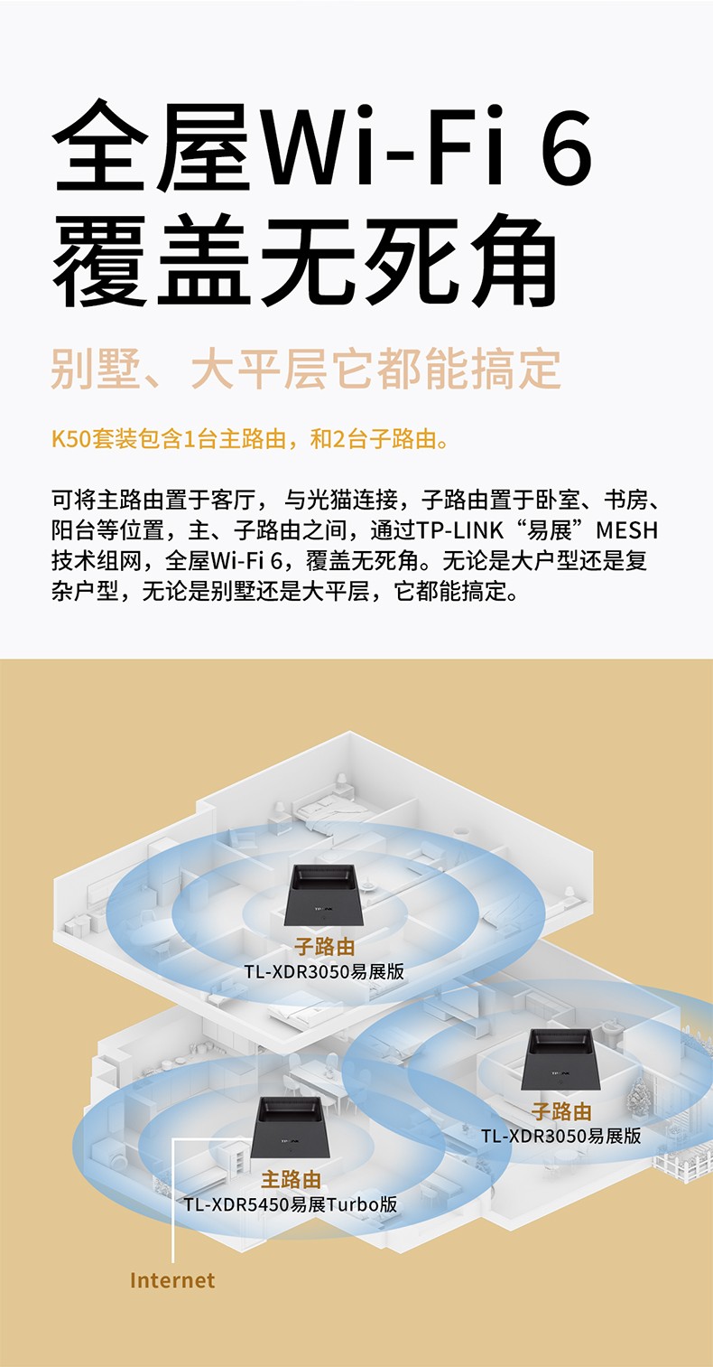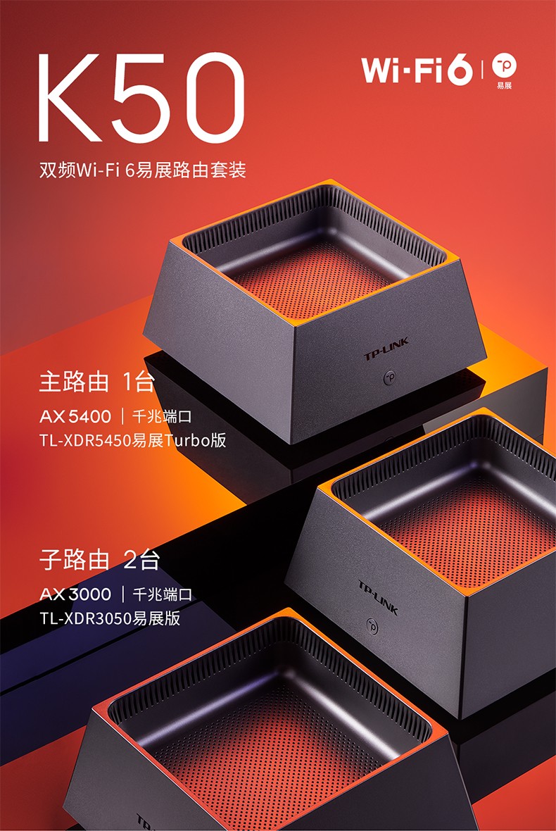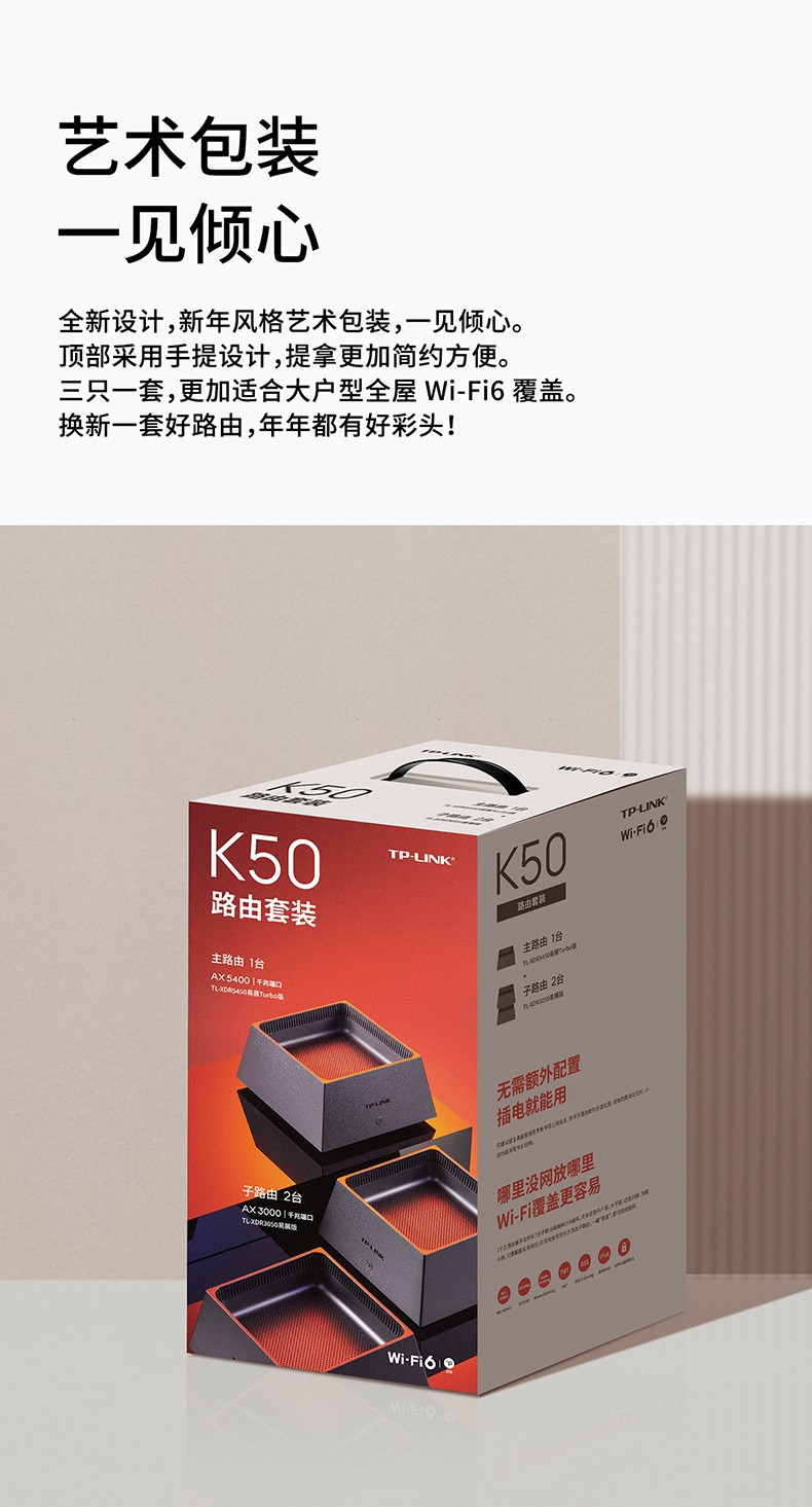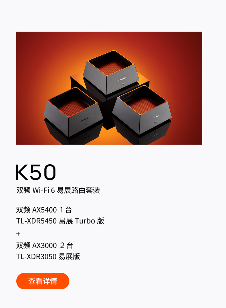 TP-LINK WiFi6全屋覆蓋套裝 AX5400+AX3000 mesh子母路由器 全千兆高速5G千兆端口tplink家用無(wú)線大戶型K50